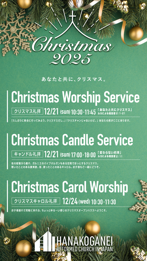クリスマス 2025 ~Christmas 2025~ 掲載日:2025年12月21日 あなたと共に、クリスマス。 日本キリスト改革派 花小金井教会では、あなたと共にクリスマスを祝います。 12/21(日) 10:30よりクリスマス礼拝、17:00よりキャンドルサービス、12/24(水)10:00よりクリスマスキャロルを行いますのでぜひ、いらしてください。 日本キリスト改革派 花小金井教会では、以下の通り、あなたと共にクリスマスを祝います。ぜひ、いらしてください。クリスマス礼拝 12/21 10:30-11:45キャンドルサービス 17:00-18:00クリスマスキャロル 12/24 10:30-11:30 この記事に添付ファイルはありません